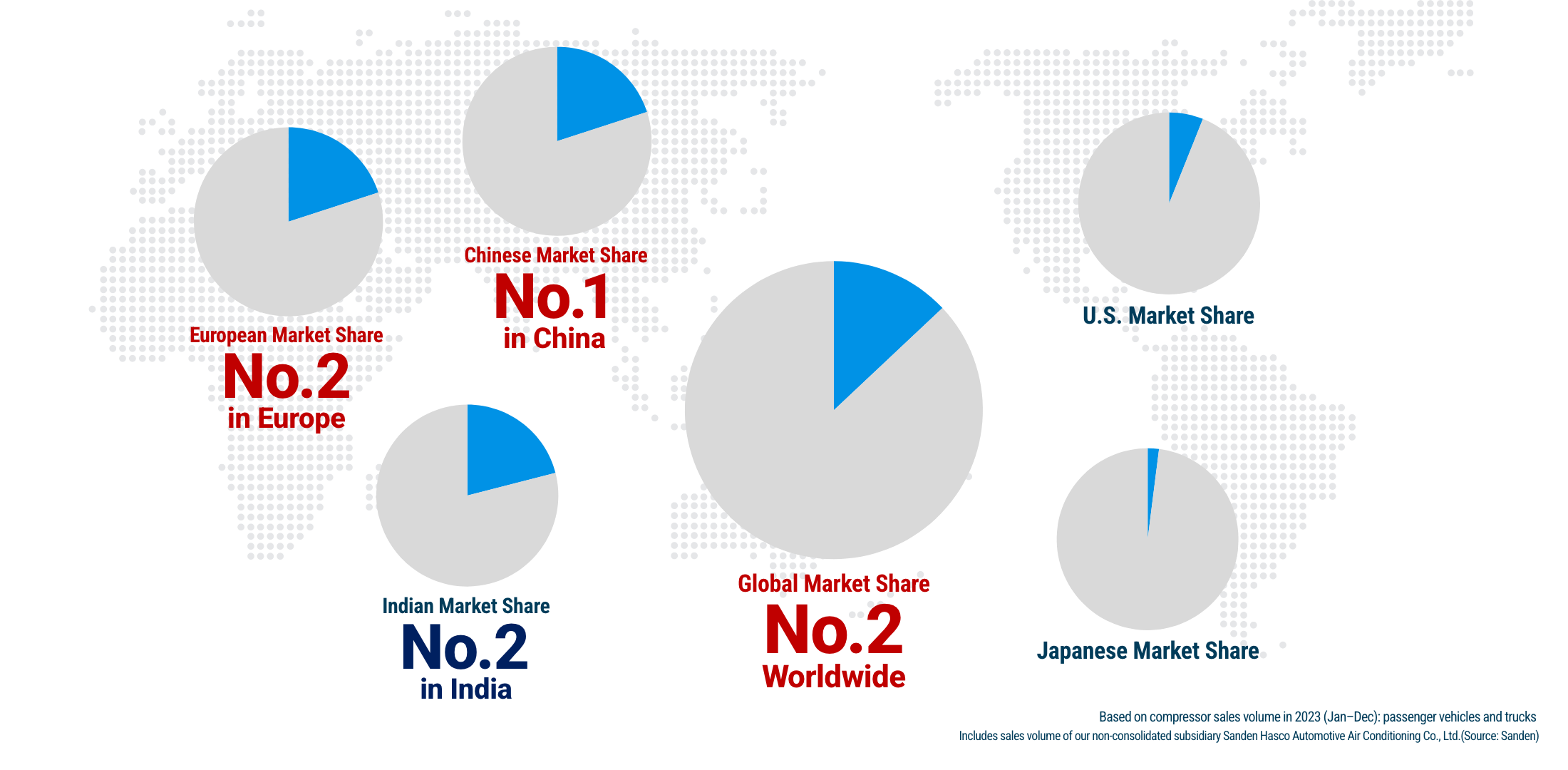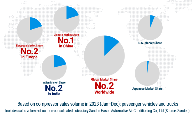 Sanden holds the second-largest global market share in automotive air conditioning compressors. Regionally, Sanden ranks No. 2 in Europe and No. 1 in China, the world’s largest automotive market.