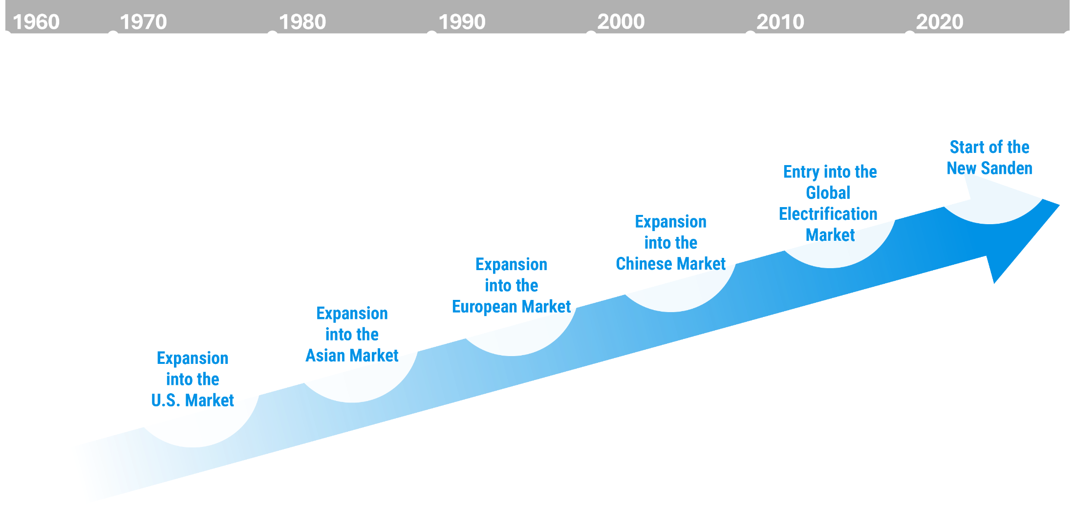 Sanden was founded in 1943 as Sankyo Electric Co., Ltd., and changed its name to Sanden Corporation in 1982. In 1970, it entered into a technical partnership with Mitchell Corporation in the U.S. for car air conditioning compressors, marking the start of its global expansion. In 1981, Sanden was the first company in the world to develop, produce, and sell scroll-type compressors. In 1988, it acquired Vendo, the second-largest vending machine manufacturer in the U.S. The company then expanded into the Asian, European, and Chinese markets, and now operates in 22 countries with 46 locations. 93% of total revenue is derived from overseas sales.
