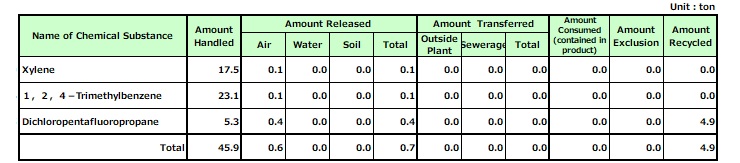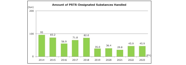 In response to the global trend of increasing restrictions on the use of chemical substances, Sanden is striving to reduce its use of chemicals covered by Japan’s Pollutant Release and Transfer Register (PRTR) system and comply with relevant laws and regulations by engaging in diverse activities designed to progressively diminish its use of problematic chemicals.