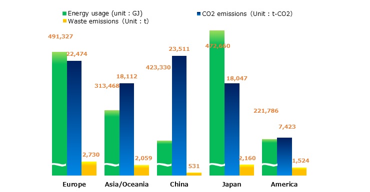 We gather important physical volume data related to environmental impact—such as data on the amount of energy used, the amount of CO2 emitted, the amount of waste generated, and amount of water usage—with respect to the parent company as well as Group companies in Japan and overseas.