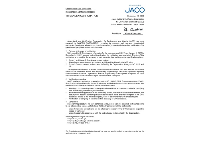 Sanden Group's environmental performance data on GHG emissions and energy consumption was verified by a third party, Japan Audit and Certification Organization for Environment and Quality (JACO), and received a limited assurance in accordance with ISO 14064-3:2019.