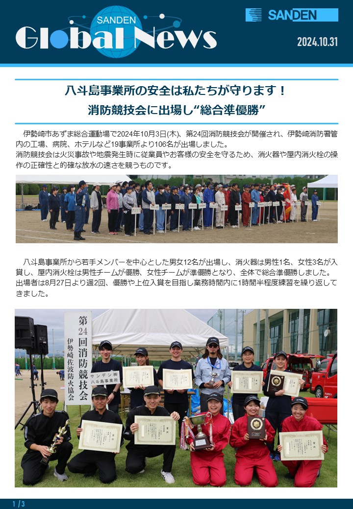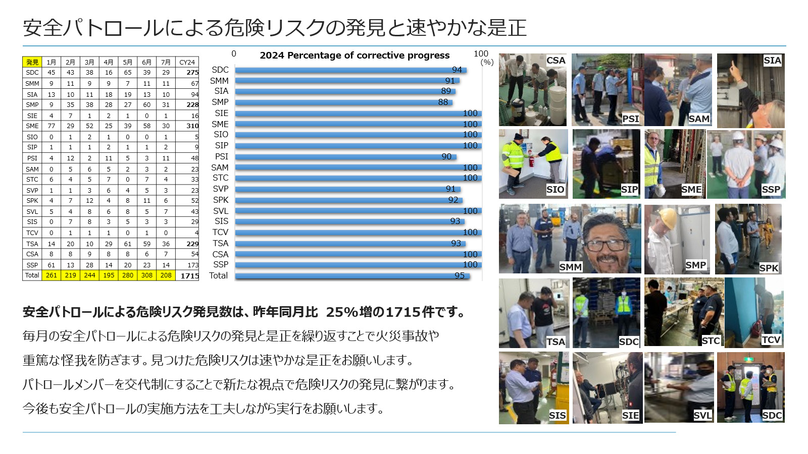 社内で働くすべての方の健康・安全を守るべく、グローバル安全衛生推進体制により全社の安全衛生活動を推進するため、毎月国内各拠点の安全衛生委員会、四半期ごとにグローバル安全衛生委員会をそれぞれ開催し、安全衛生方針展開、安全衛生統一指標のKPI管理のほか、事故や火災、怪我の未然防止のため、月次パトロールや定期点検の実施と是正の指示を行うとともに、グローバル拠点の安全衛生活動における顧客表彰や良好実践事例、活動推進者などをGlobal Newsとして配信し安全衛生活動の推進を図っています。