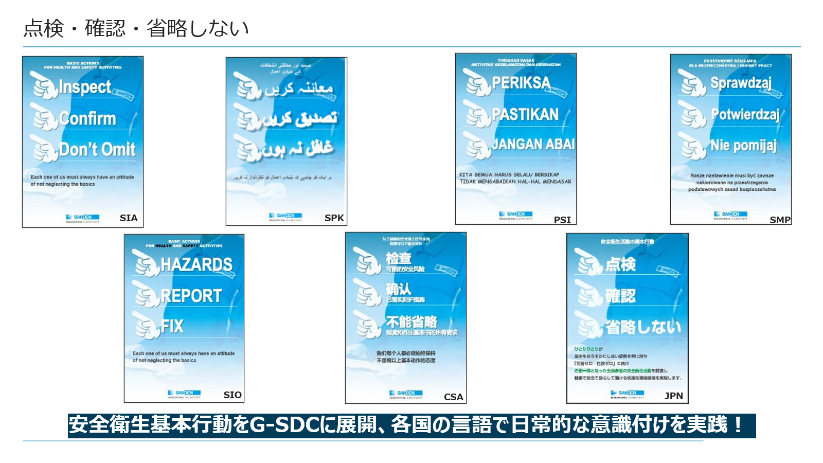 国内従業員に対して毎年安全衛生教育を実施しています。労働基準監督署長特別講演は管理職、管理監督者、安全管理者、衛生管理者に加え、派遣会社担当者を受講対象者として労働安全衛生教育を実施し、未然防止活動を推進する上で重要なポイントを事例を交え講演いただき、『点検・確認・省略しない』の3つのキーワードを用いてポスターを社内デザインし、国内のみならず海外拠点にも展開しています。拠点の言語や風土に合わせ文言も取り入れ職場に掲示しています。